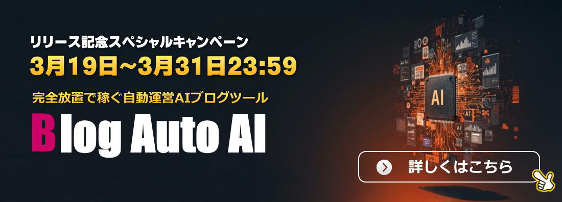 自動運営AIブログツール「Blog Auto AI」の先行販売では100名以上を超える多くの方にてにしていただきました。そして3月19日、大幅アップデート、追加購入特典を用意して、一般販売を開始いたしました。 「Blog Auto AI」は、 完全自動でブログを 運営してくれるツールです。 自動運営までの手順を 簡単に説明すると、 *************