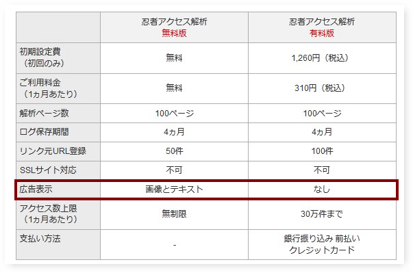 ちなみにこれは忍者アクセス解析の無料版と有料版の違いです。