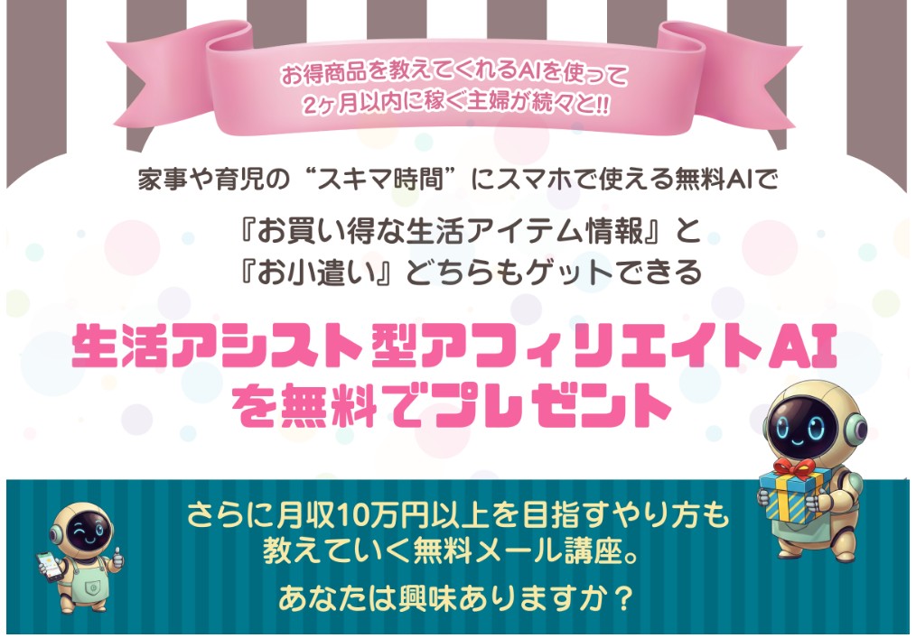 全てAIにお任せ。あなたの生活をサポートする『お買い得な生活アイテム情報』を教えてくれて、ついでに月20~30万円のアフィリエイト報酬まで稼げてしまう。