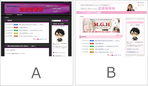 続きを読むふたつの恋愛系アフィリエイトブログがふたつあります。 さて、あなたならどちらの恋愛系ブログを読みたいと思いますか? 実はこのふたつのブログはAからBに私がカスタマイズしたものです。 どちらもテンプレートは賢威5.0を使っています。 Aはクール版を、Bはプリティー版を使っています。 ▼恋愛初心者のための恋愛指南塾 恋愛系のブログで背景が黒でも悪くは