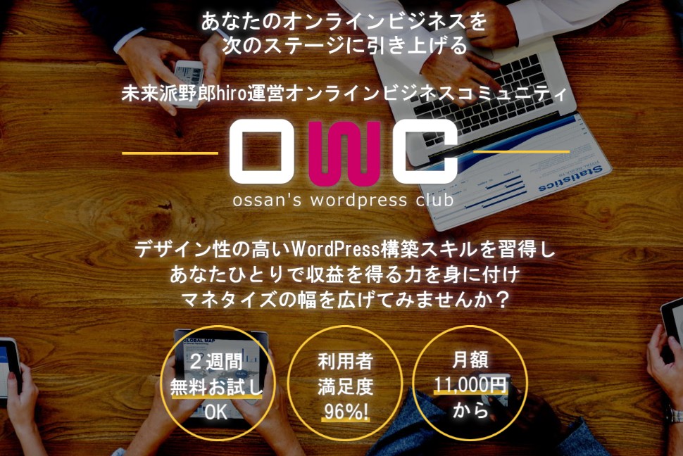 『おっさん』の『おっさん(未来派)』による『おっさん』のためのWordPress+WEBデザインに特化したコミュニティーサービス、「おっさんず WordPress CLUB」の頭文字をとって、通称「OWC」ですが、おかげさまでたくさんの方に参加いただいております。