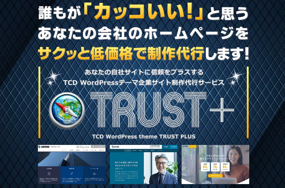 「TRUST+」は、権威性と理性を強調する士業、医療、企業サイト向けのTCDテーマを使い、あなたの会社のイメージに「TRUST:信頼」をプラスするサイト制作代行するサービスです。