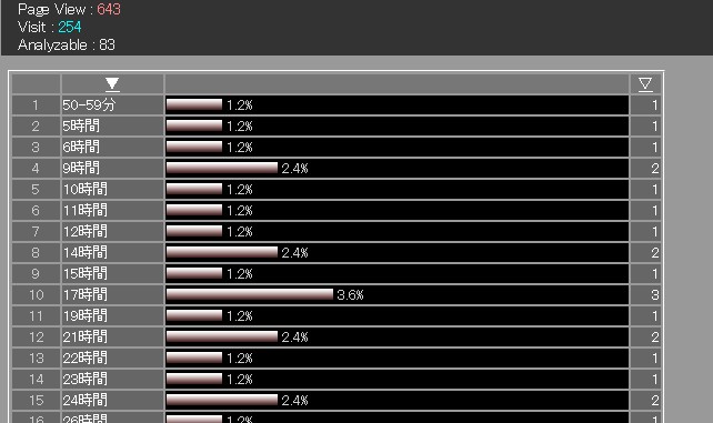 時間ごとのアクセス(PageView・Visit)が棒グラフで表示されます。